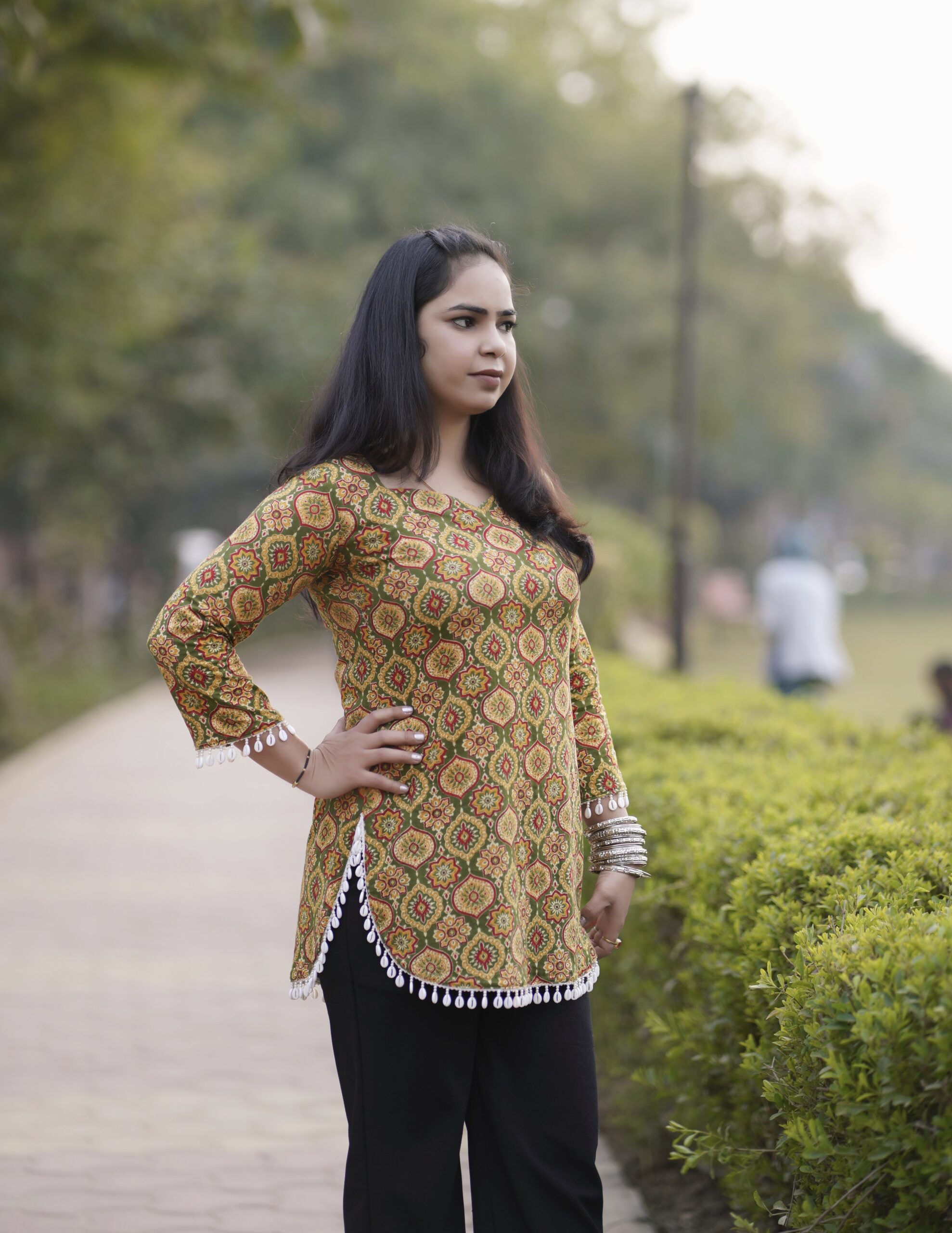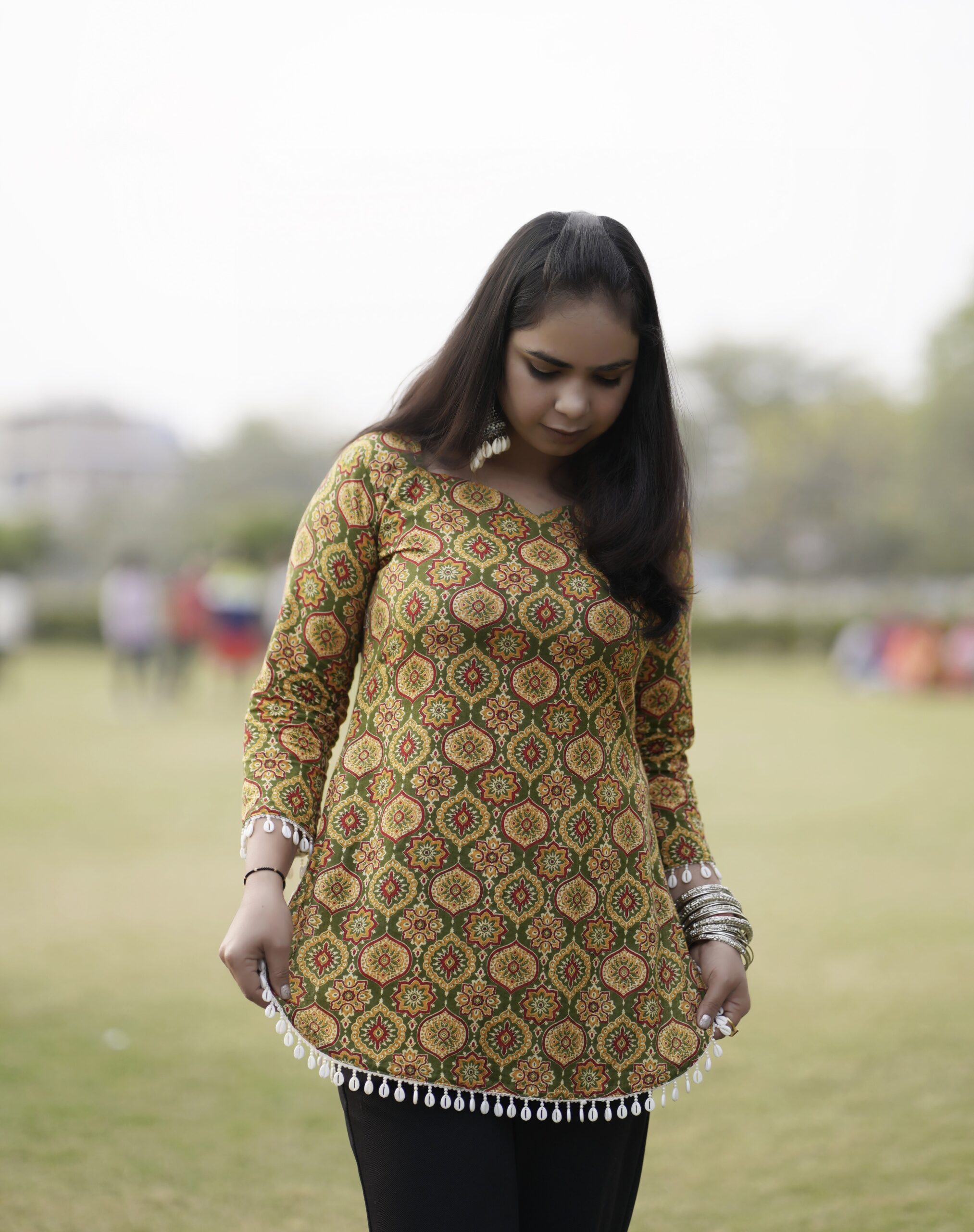 Add a royal ethnic charm to your wardrobe with our  Ajrakh Pom-Pom Kurti. Designed in soothing green tone with traditional Ajrakh-inspired motifs, this kurti reflects true Indian craftsmanship.